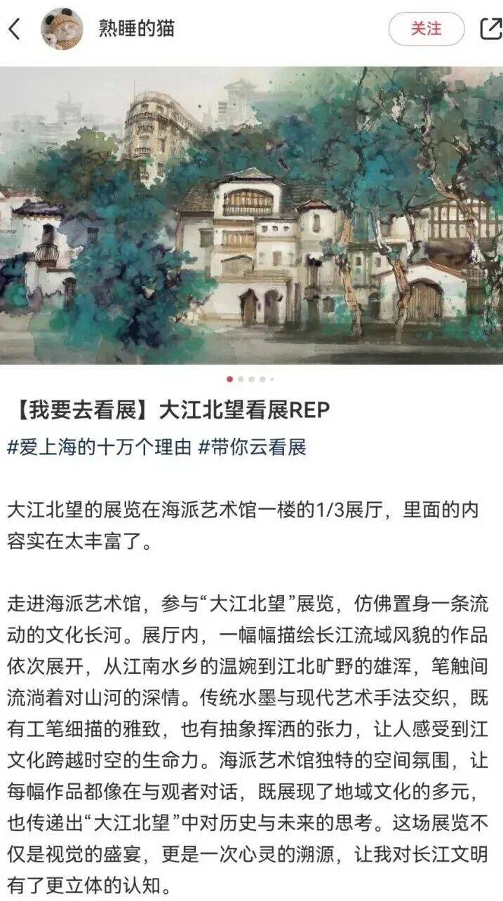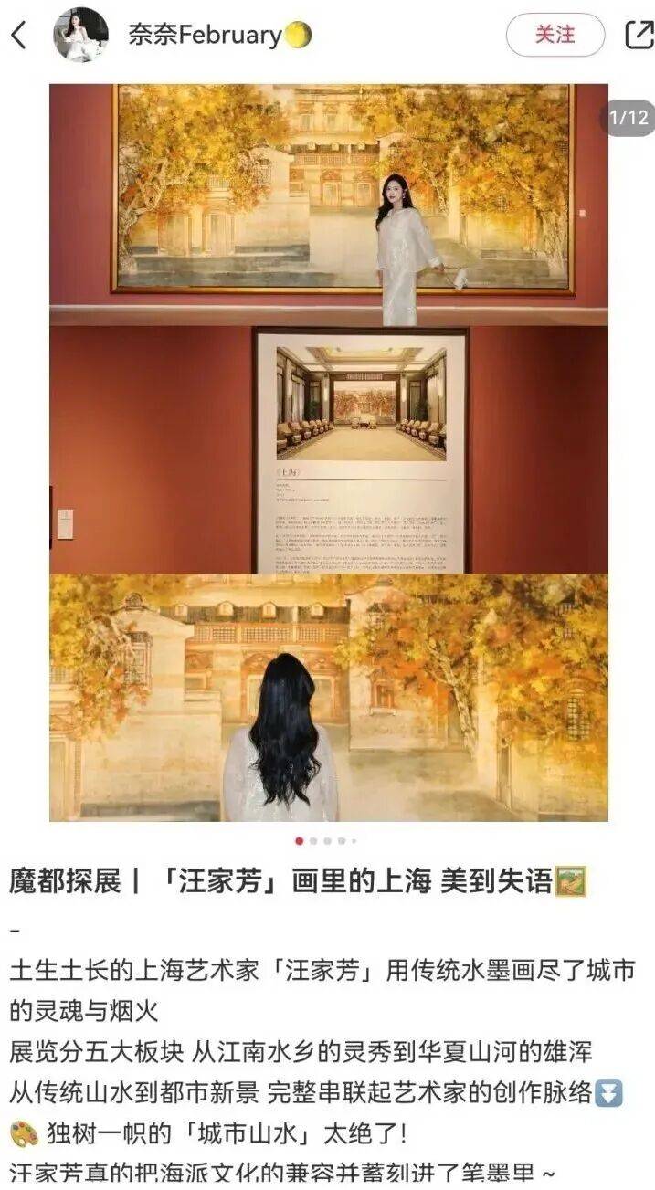 穿了一身黑色新中式连衣裙去看展,没想到和汪家芳老师的“城市山水”如此契合。当传统水墨的笔触勾勒出我熟悉的外滩和苏州河,从小就住在苏州河边,那种厚重笔墨下的灵秀,一下子抓住了我,特灵了! - 另外那幅《西岳华山》系列也很nice,水墨晕染开的巍峨群山,充满视觉冲击力 - 整个空间通透安静,很适合慢慢走、静静看。如果你也喜欢这种传统与现代的对话,推荐你来感受一下 #⼤江北望#汪家芳#海派艺术馆#上海看展#城市⼭⽔#魔都看展#周末去哪⼉