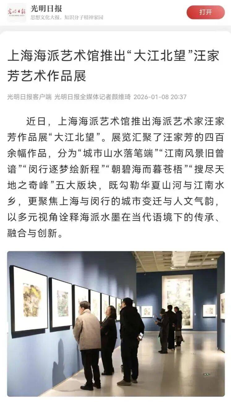 汪家芳是知名的山水画家,近几年作品频频亮相许多重要场合,这次《大江北望》画展是历年展览规模最大,分量最重的大型展览;上海“海派艺术馆”是一家大型的综合性的展览馆,在2025年“热门美术馆及艺术博物馆”榜单中列为全国第54名。所以这次汪家芳的《大江北望》画展在“海派艺术馆”展出可谓精彩缤纷,惊喜不断,吸引了广大爱好者及民众踊跃参观,各家媒体纷纷前往采访及报道。