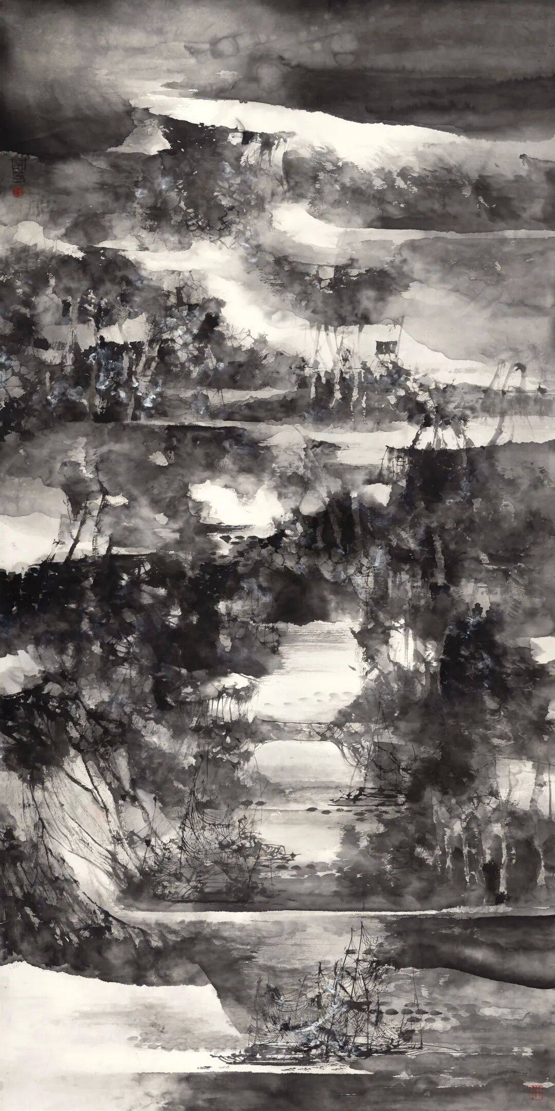 在上海海派艺术馆的展厅里,一幅长达六米五、高四米五的巨制《上海》静静地悬挂着。苏州河的波光在墨色中荡漾,外滩的天际线在水晕里生长,传统笔墨与现代都市在此刻奇妙地融为一体。这是汪家芳“大江北望”个展的入口,也是理解这位海派艺术家创作生涯的一把钥匙。四百余幅作品,如同一条从传统深处奔涌而来的江河,在“城市山水”的河口汇入当代的海洋。